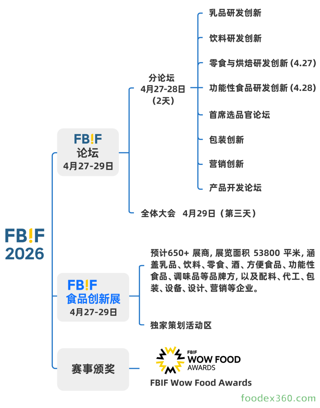 FBIF2026食品饮料创新论坛及FBIF食品创新展(FBIF超级选品会)将于2026年4月27- 29日在杭州国际博览中心举办,预计将有650+展商参展,3500+位行业嘉宾参会,将吸引47000观众观展。