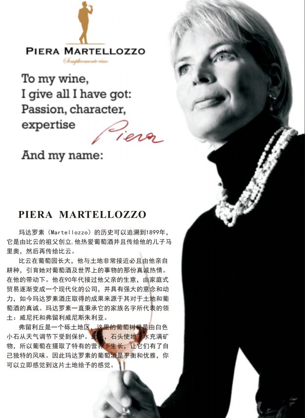 玛达罗素 (Martellozzo) 酒庄的历史可以追溯到1899年,它是由现任庄主比云的祖父创立,他热爱葡萄酒并且传给他的儿子马里奥,然后再传给到比云。比云从小就在葡萄园里长大,她的父亲的教育激发了她对葡萄酒及世界上的事物的那份真诚热情,90年代比云接过他的父亲生意,在她的带动下,玛达罗素酒庄由家庭式的贸易逐渐变成现代化的公司,并具有强大的意念和动力,直至今日它已成为意大利最大的起泡酒庄。