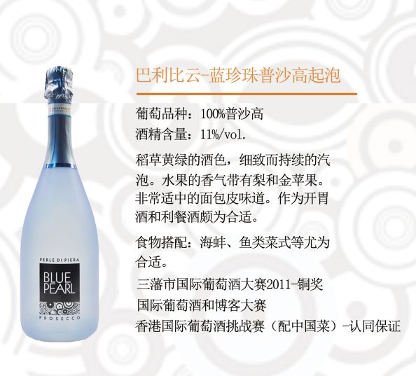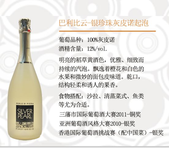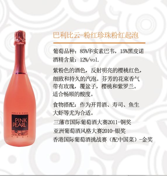 意大利巴利比云—珍珠系列起泡酒曾获得亚洲2010葡萄酒风格大奖的银奖和香港国际葡萄酒挑战赛的金奖以及三藩市2011国际葡萄酒大赛的铜奖