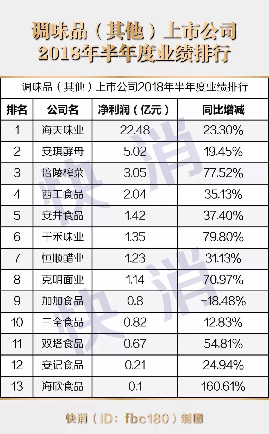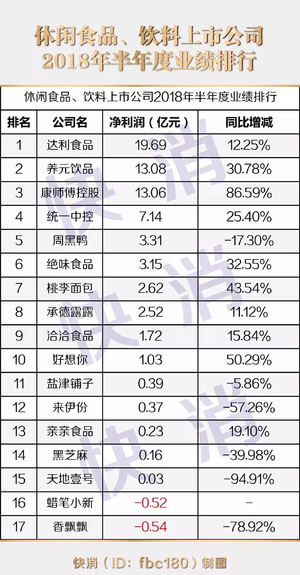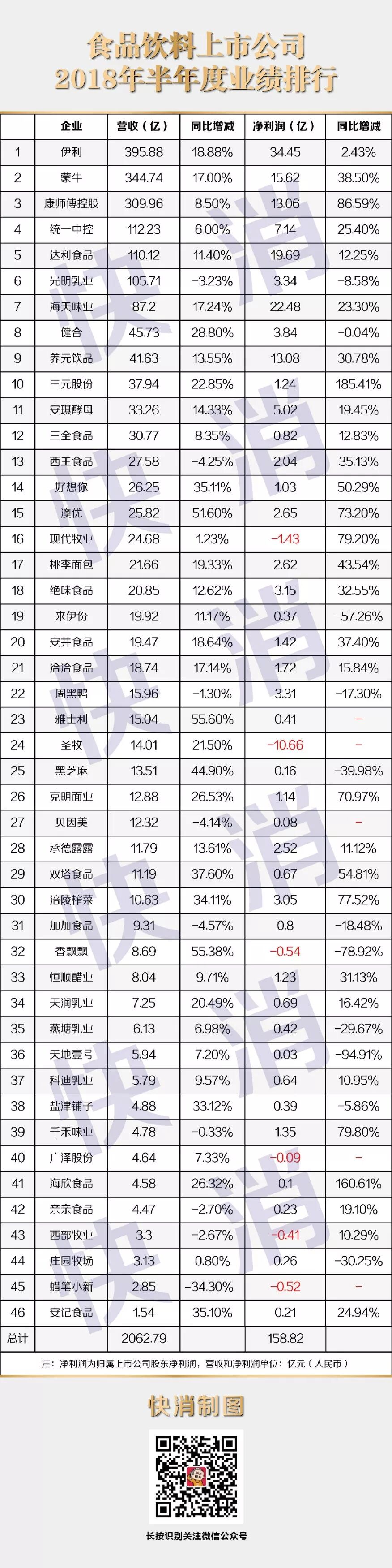 临近半年报尾端,快消整理发布《食品饮料上市公司2018年半年度业绩排行》以飨读者。本文共含4组类榜单:休闲食品与饮料排行榜、乳制品排行榜、调味品(及其他)排行榜和总榜。