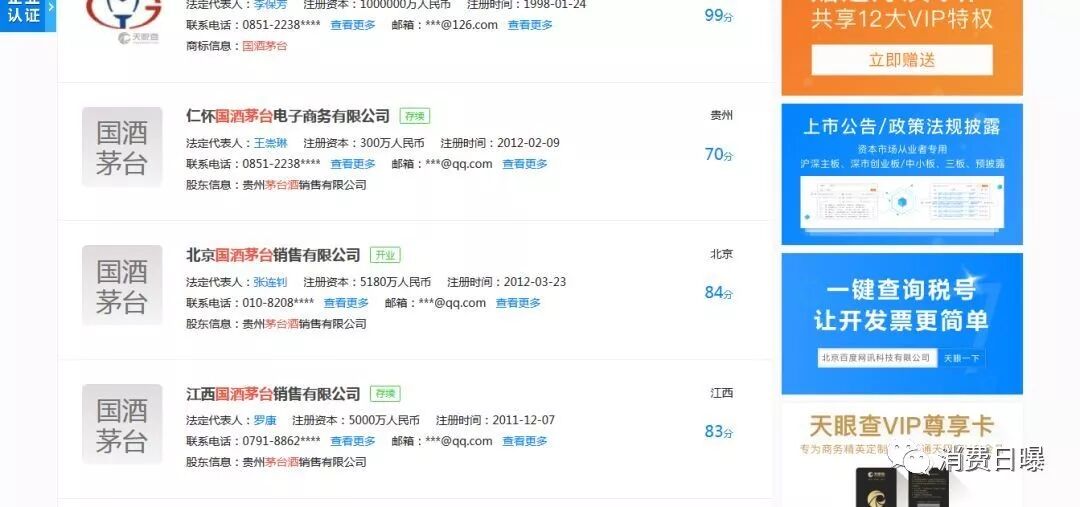 《消费日曝》通过天眼查系统了解,以国酒茅台为名字的销售公司不下40多家,这些公司因为茅台集团申请国酒茅台商标之后陆续注册,现在国酒茅台商标不存在,这些国酒茅台公司就存在问题了。