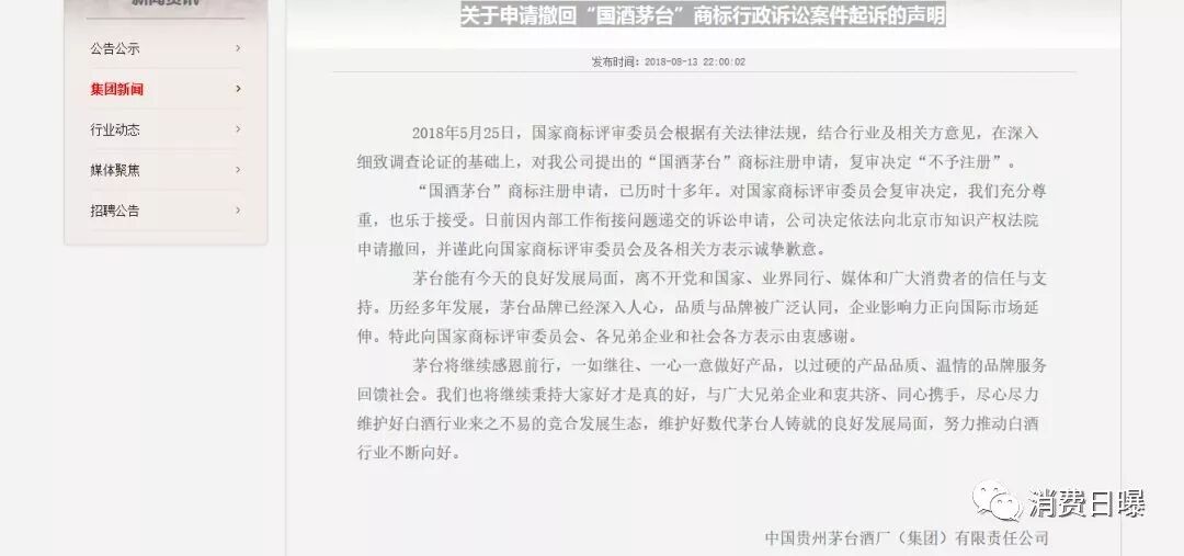 那就看一下814日《消费日曝》发布的旧文:茅台服软撤诉,国酒商标注册梦断!国酒茅台广告、专卖店、公司面临整改?!