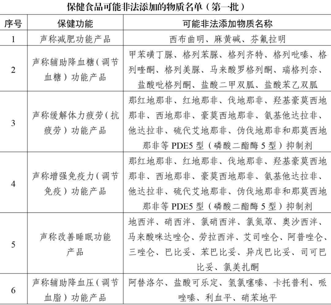 根据原国家食品药品监督管理局《保健食品中可能非法添加的物质名单 ( 第一批 ) 》(食药监办保化〔2012〕33 号),保健食品可能非法添加的物质名单如下: