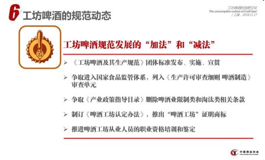 2017年7月份开始,中国酒业协会啤酒分会启动了《工坊啤酒及其生产规范》的起草工作,经过多次调研和讨论之后,征求意见稿就将在近期公布。为了考虑到中立的因素,酒协将精酿的说法变成了工坊,以区别于工厂啤酒。