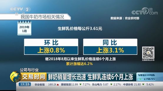 鲜奶的畅销带动了生鲜乳价格的小幅上涨。据农业农村部监测,2019年1月生鲜乳价格每公斤3.61元,环比涨0.8%,同比涨3.1%。这是继2018年8月以来生鲜乳价格连续6个月上涨,累计涨幅达6.2%。