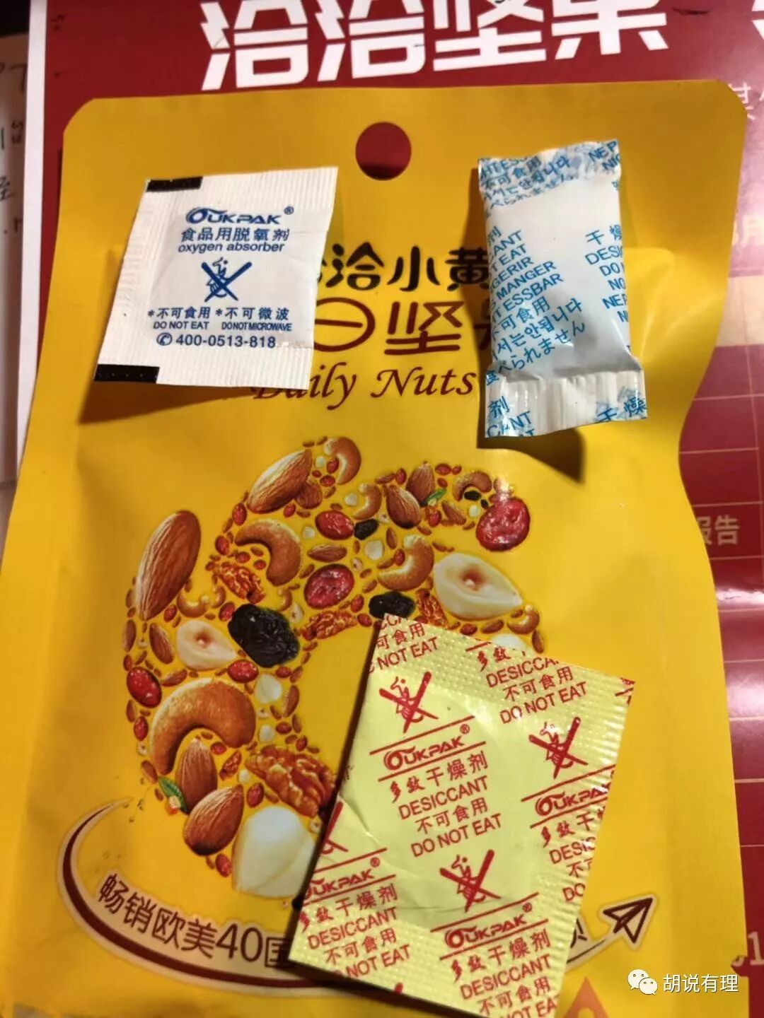 众所周知,坚果类产品时间久了,可能有哈喇味;另外南方空气潮湿,坚果类产品一旦受潮,口感也大大减分。胡说有理打开一小包洽洽“小黄袋”,发现其每包里都有这样的两个小包装(如下图上面显示):一包是脱氧剂,一包是干燥剂。这两个小包正好可以解决这个问题。