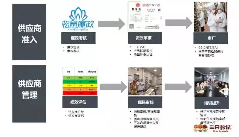 三只松鼠廉洁体系是第一道门槛。有合作意向的伙伴联系松鼠员工时,须先接受一段10分钟的电话廉洁培训,并口头承诺接受廉洁要求;当合作伙伴来访时,须先参加一场廉洁培训并满分通过考试,廉洁培训结业证是商务洽谈的唯一凭证……这些看起来有些苛刻的条款,以及由此发展出的公平交易承诺函、关联交易限制令、合作伙伴廉洁处罚细则等成为支撑起三只松鼠“线上线下同业态坚果零食全行业第一名”的底层系统。