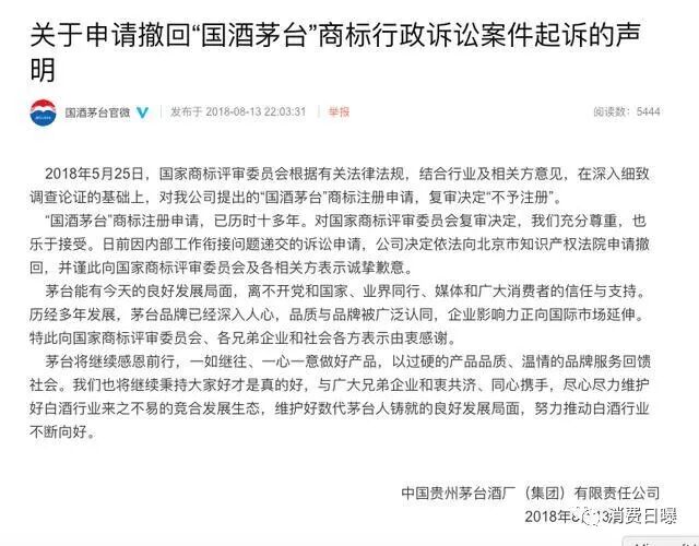 2018年8月13日,茅台集团官网宣布,放弃“国酒茅台”商标注册申请,撤销诉讼申请,并向国家商标评审委员会致歉。