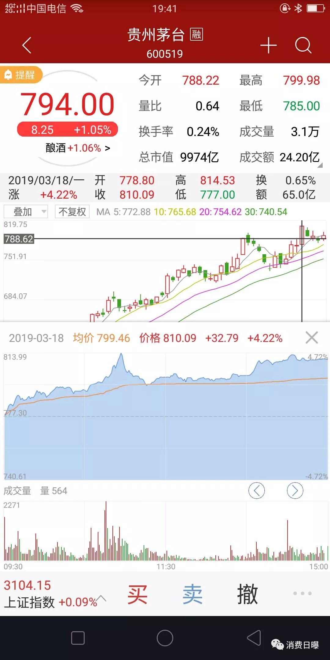 3月18日早盘,茅台市值盘中突破800元,并一度创下历史高点814.53元,市值再度破万亿。截至午间收盘,茅台涨2.91%,报799.90元/股。