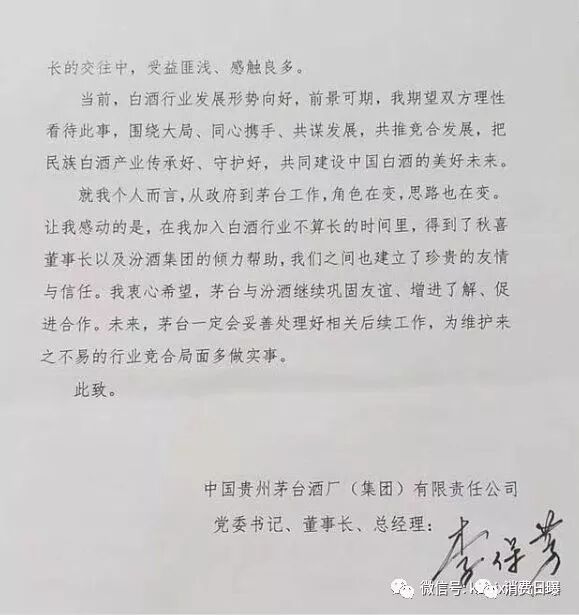 在信函中,李保芳表示:两天前,我们已决定,撤回“国酒茅台”商标诉讼。在此,我谨代表茅台集团,就这件事情给您和汾酒集团带来的困扰表达真诚的歉意。