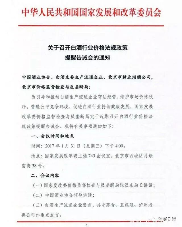 2018年1月31日,国家发改委价监局在北京召开了白酒行业价格法规政策提醒告诫会,茅台、五粮液被点名作重点发言。