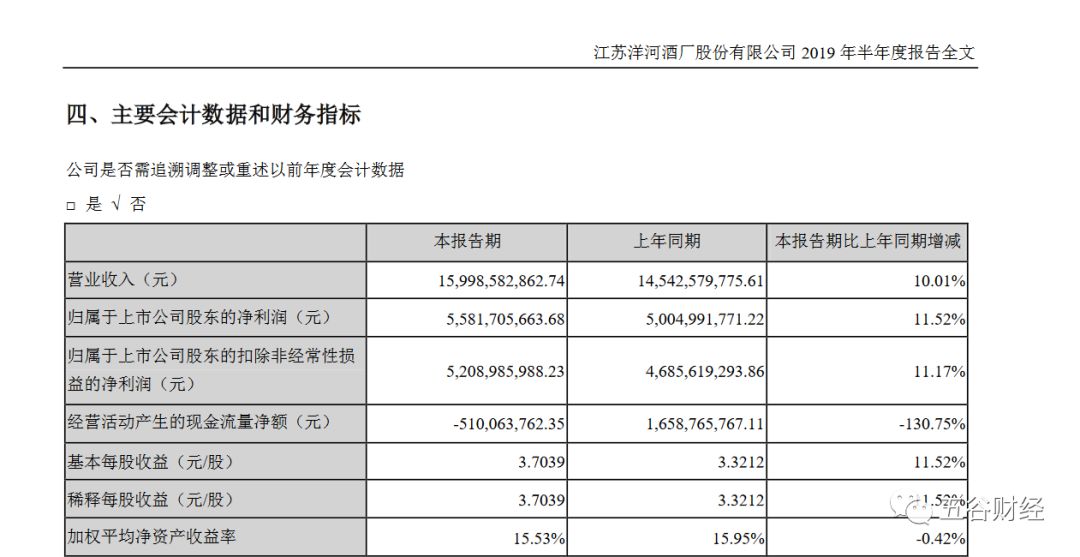 记者粗略计算一下,2019年第二季度,洋河股份的营业收入约为51.09亿元,与去年同期50.05亿元,增幅仅为2%;归属于上市公司股东的净利润约为15.61亿元,相较于2018年上半年15.3亿元,增幅在2%左右。
