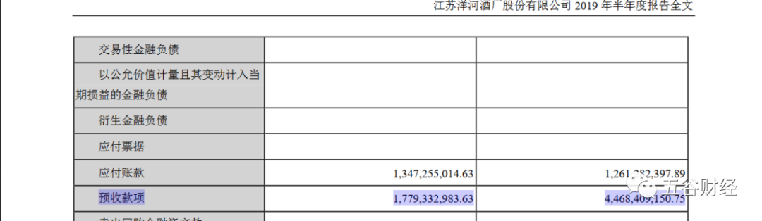 公告显示,截止2019年上半年末,洋河股份的预收款项约为17.79亿元,与2018年末44.68亿元相比,降幅在60%以上。