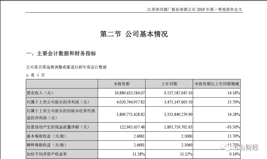 2019年第一季度,洋河股份的营业收入约为108.9亿元,与去年同期95.38亿元相比,增幅在14%左右;归属于上市公司股东的净利润约为40.21亿元,相较于2018年第一季度34.75亿元,增幅在16%以内。