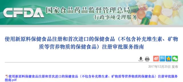 而在近日,即12月25日,CFDA行政事项受理服务官网再度发布《使用新原料保健食品注册和首次进口的保健食品(不包含补充维生素、矿物质等营养物质的保健食品)注册审批服务指南》(以下简称“新注册指南”)。该“指南”近一步明确了保健食品注册审批的禁止性要求,这是应对新时代、新法规、新管理模式下保健食品产业创新发展、保障保健食品质量安全所做的进一步突破与规范。