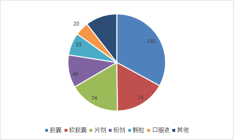 图3 2020年1-2月国产延续注册类保健食品数量(按受理时间)从产品剂型上看,胶囊(207个)、软胶囊(109个)和片剂(106个)为主,三者数量占总数74%。胶囊剂产品的原料以灵芝(含灵芝孢子)、西洋参、黄芪等传统中药类原料为主;软胶囊产品的原料主要以蜂胶、维生素E、鱼油、β-胡萝卜素等最为突出;片剂产品的原料以枸杞子、维生素矿物质等为主。