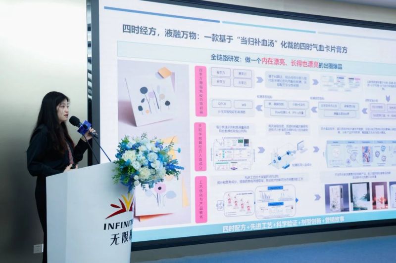 赵宏伟表示,无限极立足用户需求,以严谨态度对经典方剂进行化裁组方,注重明确并传递组方的科学内涵。分享中,她介绍了多款源自经典方剂的产品,通过具体案例详细阐释无限极如何将传统方剂与现代健康需求结合,精准开发适用于不同健康方向的产品,展现了经典方剂现代化应用的创新探索与实践成果。