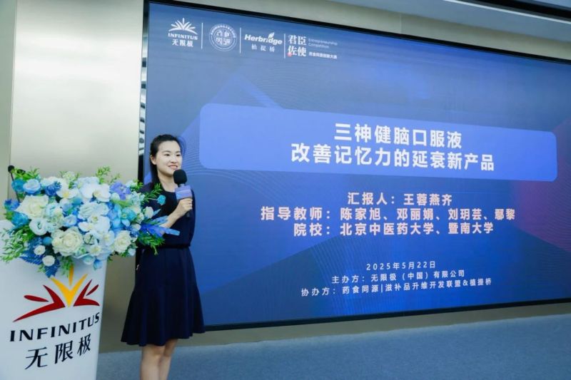 北京中医药大学中医诊断学博士研究生王蓉燕齐带来了【基于三神散的新产品研发】的项目分享,她表示,项目诞生于脑健康、延衰市场不断增长的背景下,源自经典名方,团队通过将三神散与功能因子相结合,针对记忆力方向,并进行了实验验证。通过现代化的工艺,让产品的浓度更高、口味更好。