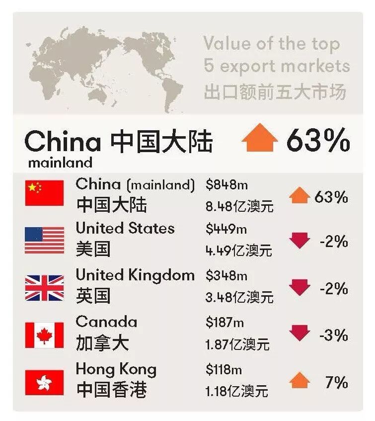 中国大陆(增长63%至8.48亿澳元,占据全球出口总额33%)