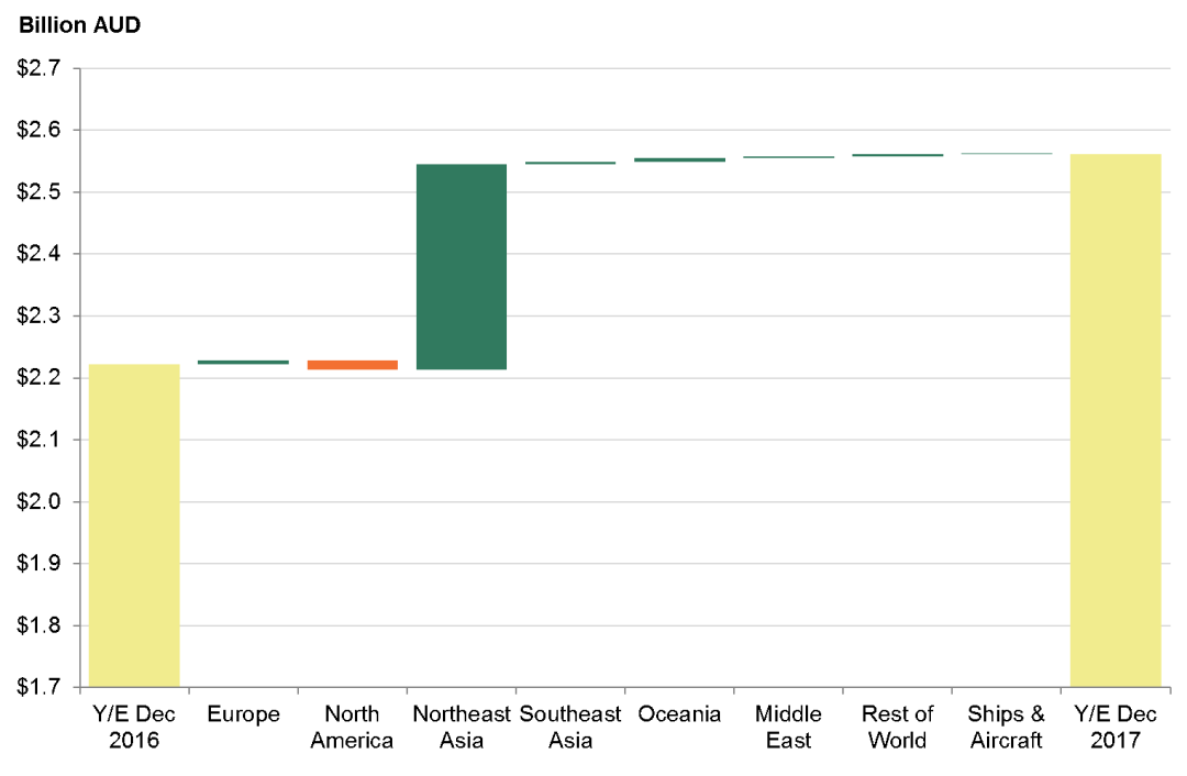 美国(降低2%至4.49亿澳元,占据全球出口总额18%)